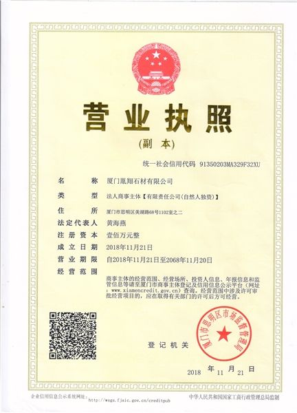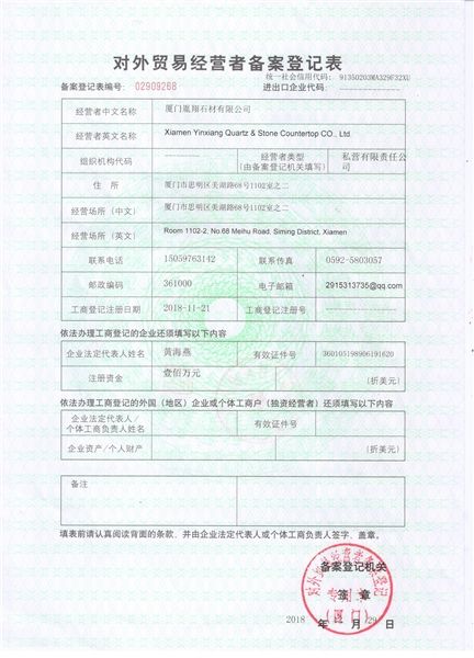 Xiamen Yinxiang Artificial Marble Co., Ltd. was established in 2016.The company is headquartered in Xiamen, covering an area of 370 square meters;The branch company is located in Shuitou, the exhibition hall covers an area of 100 square meters. The founder of the company is Mrs. Huang. The total number of full-time employees is 26, including 6 in the quality inspection department, 1 in the booking department, 2 in the human resources department, 2 in the accounting department, 9 in the sales department, 1 in the documentation department, 1 in the graphic design department ,1 in the space design department, 1 in the advertising design department, 2 in the CAD drawing and dismantling department. The total area of Xiamen company is 370 square meters, and the area of Shuitou exhibition hall is 100 square meters. We are an enterprise with good reputation and rich experience integrating industry and trade, specializing in processing and selling marble and granite products. We export our own natural marble to all over the world, select and purchase suitable natural stone blocks from Turkey and Greece, and process them into slabs; we can process the stone into any shape according to the needs of different customers, such as: Wall cladding, floor tile, stairs,window sill, door sill, counter top, vanity top, table top,handicraft, tombstone, outdoor paving and landscaping etc. In addition, we also provide export services to abroad stone customers, such as: local marketing, price negotiation, quality controlling, and shipping services (door-to-door). We patiently provide customers with a variety of stone options, including the price and quality of different slabs of the same material; Our company is pleasure to provide OEM processing for customers. It will establish a local brand for our customers, indirectly reduce the loss of end customers and increase new customer resources; we strictly protect the privacy of each customer and create greater market share for customers. The founder of our company has 13 years stone experience and is familiar with more than 1,000 materials of natural stone. Because our company is close to the mountains and the sea, and is very familiar with the market in our town.Our team is able to locate the original processor of the stone on the same day based on clear photos provided by the customer. Our market has expanded to Southeast Asian countries, Central Asian countries, West Asian countries, Middle East countries, North and South American countries, and African countries; our company has become a long-term and stable supplier to our regular customers; Our founder has advanced business philosophy and Interculture experience; Our team has a strong sense of service 、fluent foreign language advantages、 strict quality control and supervision system;We are carefully choosing the cheapest sea freight to our customers , reducing the pressure on purchasing work of our customers and save their valuable time and energy. Our company adheres to the firm belief of providing reliable and high-quality products and strives to provide customers with superior services.